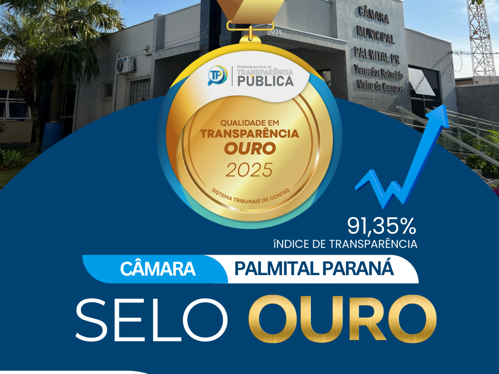 A Câmara Municipal de Palmital recebeu o Selo Ouro de Transparência Pública 2025, alcançando 91,35% no índice de transparência. O reconhecimento é concedido pelo Programa Nacional de Transparência Pública e destaca a qualidade das informações disponibilizadas ao cidadão, reforçando o compromisso da instituição com a gestão pública responsável e transparente.